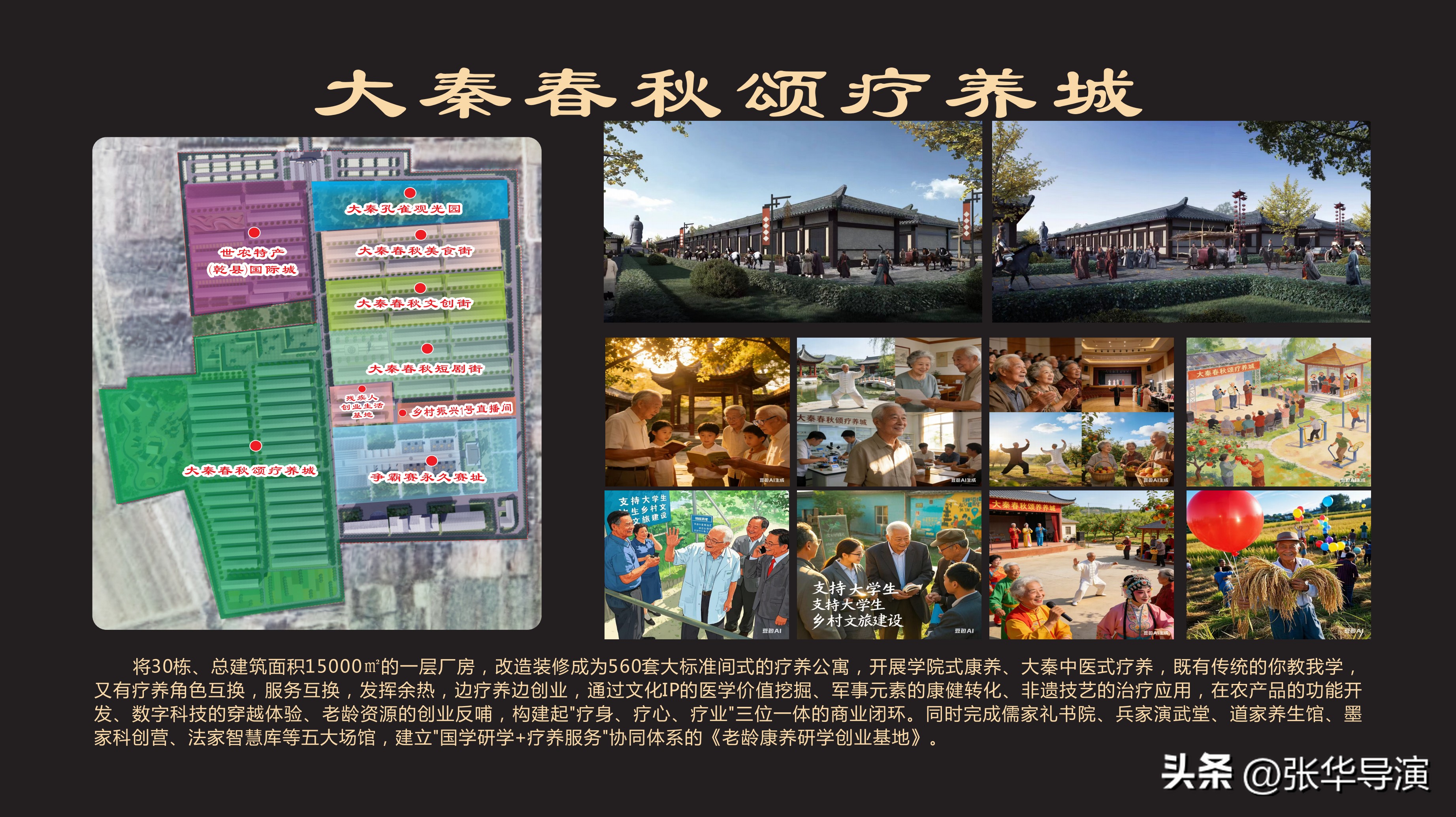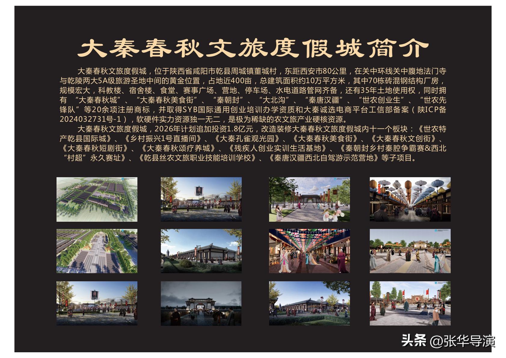 项目以“吃、喝、宿、用、玩、观、动、学”一体化为核心理念,精心规划了十八大特色业态,包括:世农特产(乾县)国际城、大秦孔雀观光园、电商孵化基地、大秦亲子欢乐城、大秦春秋颂康养城、大北沟酱香鸭绝味坊、大秦春秋美食街、大秦春秋文创街、乡村振兴1号直播间、大秦春秋短视频短剧制作基地、秦朝封乡村秦腔争霸赛、大秦春秋研学城、丝农文旅职业培训学院、残疾人创业生活基地、皇家博物馆、关中钓鱼岛、秦唐汉疆西部自驾游基地、周城大集。这些业态相互赋能,将为游客提供沉浸式、全链条的文旅体验。